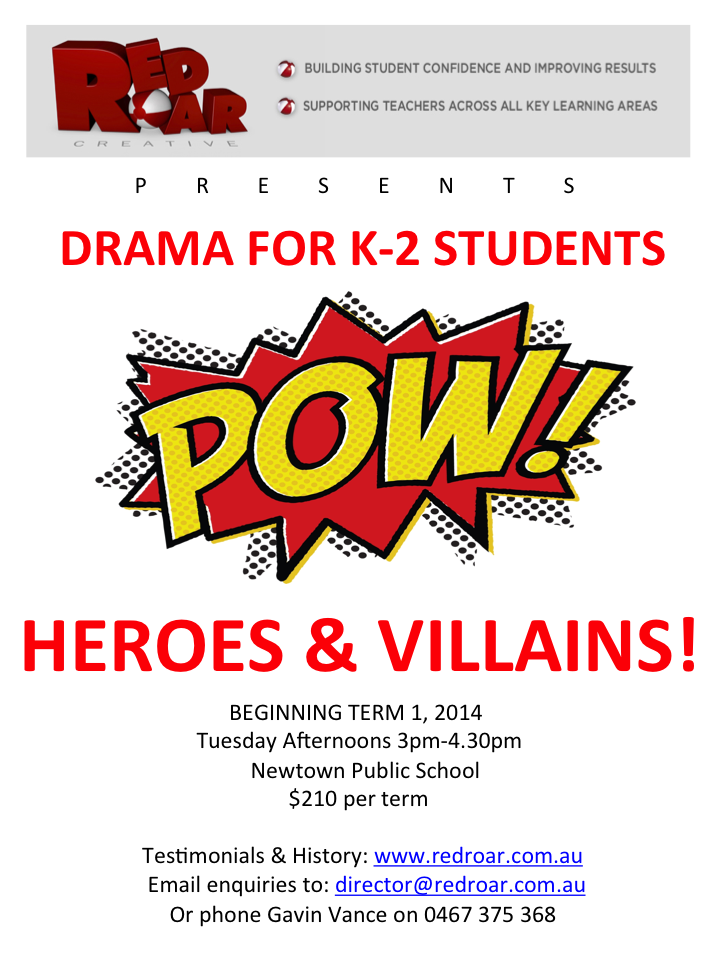 Due to extra demand, we are now offering another afternoon of fun Creative Arts Activities at Newtown Public School. Starting Week 1 of Term 1, 2014, Playbuilding 1 “Heroes and Villains” is a fantastic introduction to drama games, story telling and impro exercises for K-2 students.